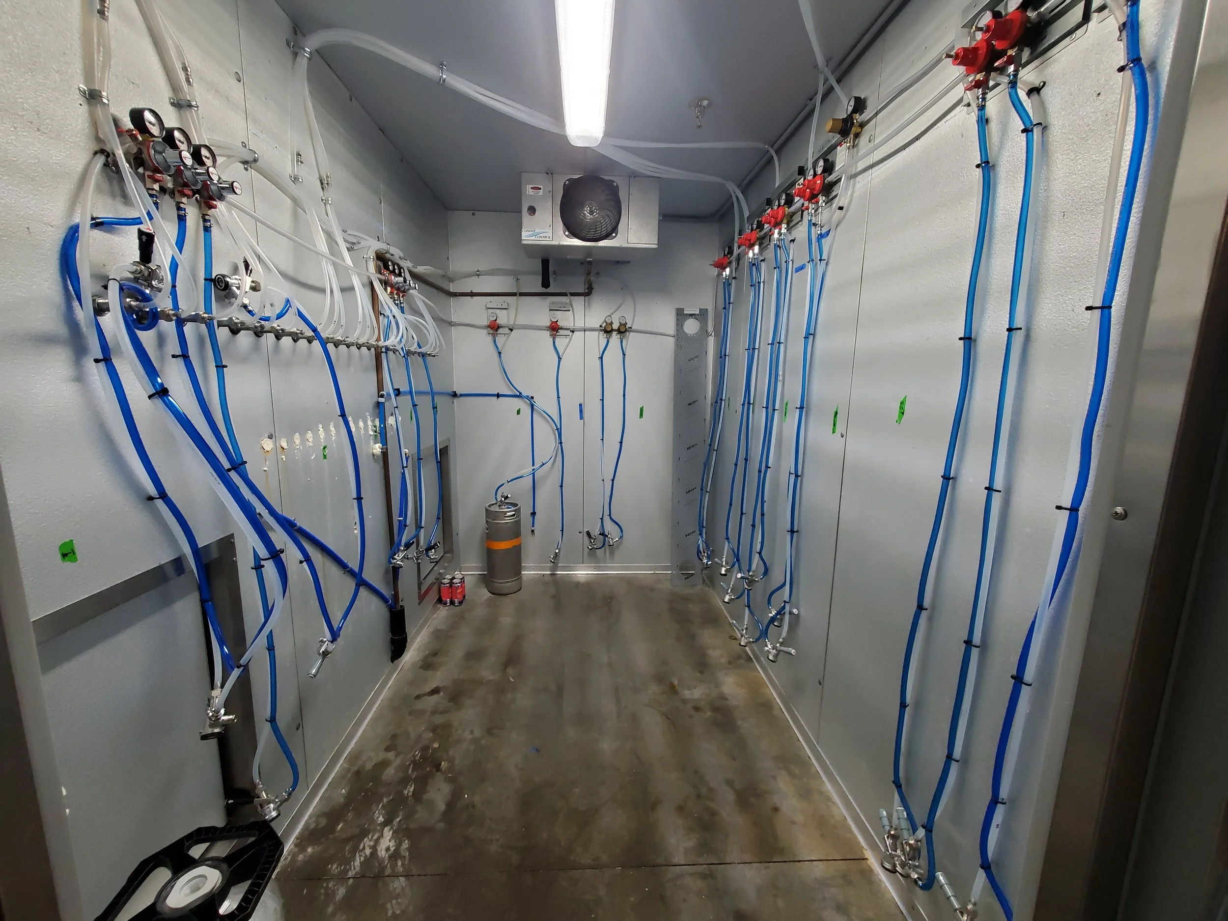 Installed long-draw system with 50-foot lines, two glycol units, six drip trays (each with nine products and individualized restriction), nitrogen separator, CO2 monitor/alarm, along with multiple gas blends, line restrictions to allow for beer, cider, wine, seltzers, soda, and kombucha on tap.